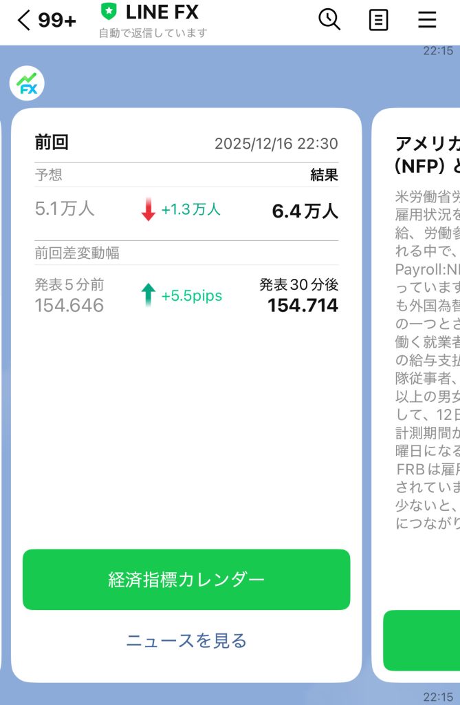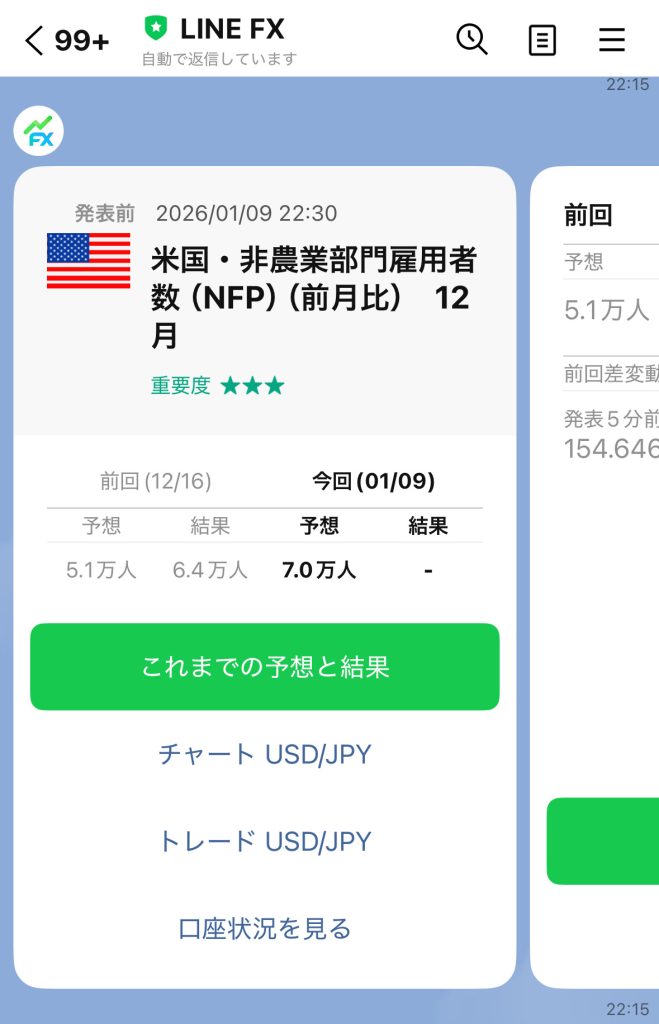 2つ目が経済指標通知です。発表の「直前リマインド」と「結果速報」の両方がLINEで届くのが便利です。