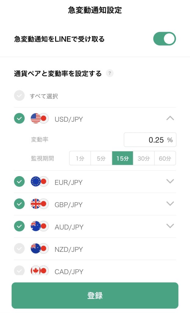 1つ目が急変動通知です。ポジションのエントリーや決済のきっかけに役立ちます。