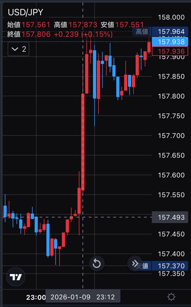 2026年1月9日、23時台に高市首相が衆院解散を検討とのヘッドラインでドル円(USD/JPY)が急騰した場面です。