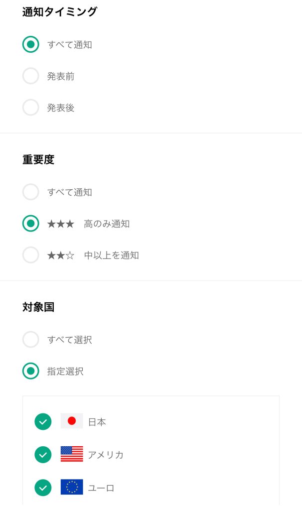 通知のタイミングや、指標の重要度、対象の国についても自由に設定が可能。