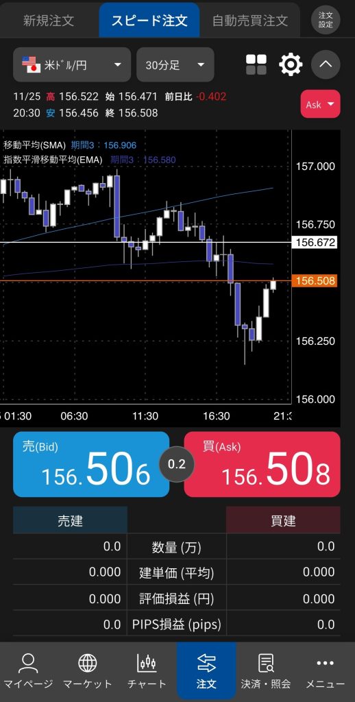 松井証券 FXアプリの機能の1つである、気配をタップするだけで即発注できる「スピード注文」がとても使いやすいです。